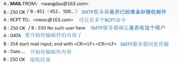 - SMTP规定了14条命令(几个字母)和21种应答信息(三位数字代码+简单文字说明)