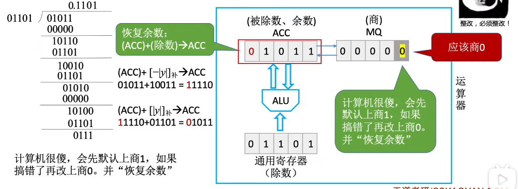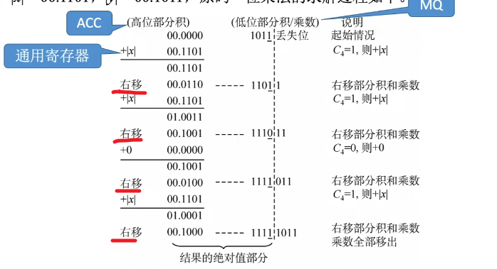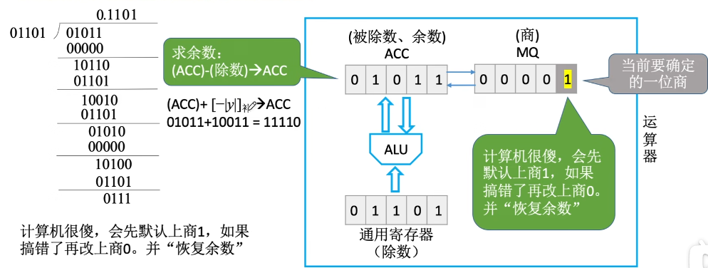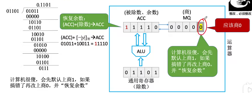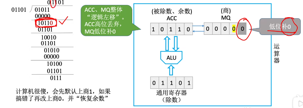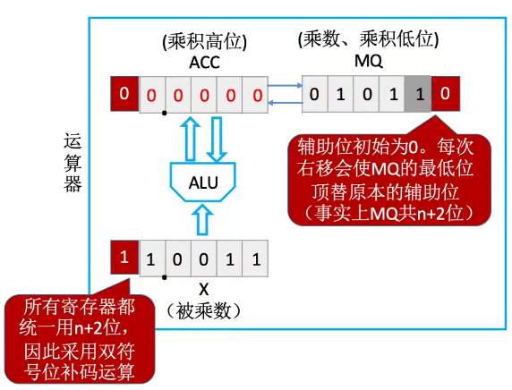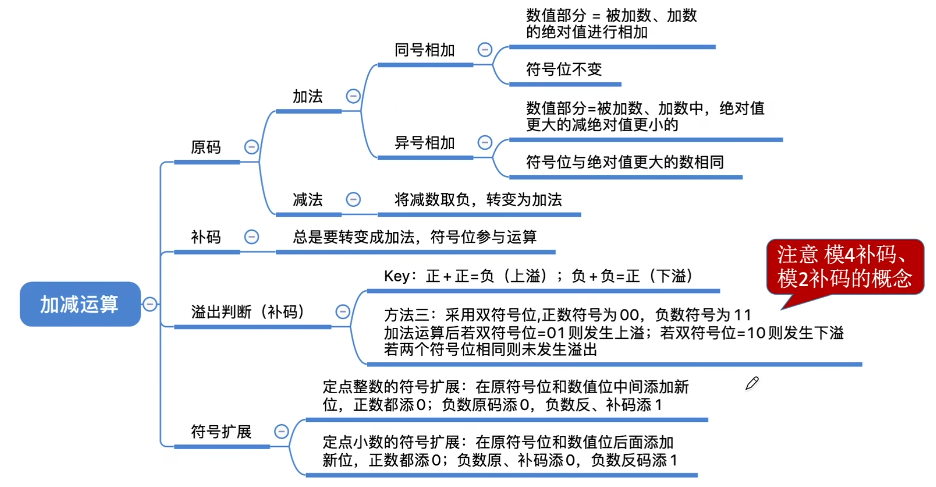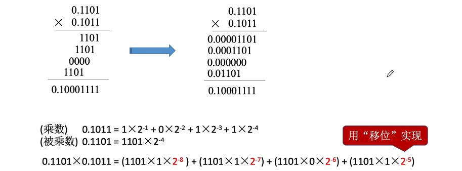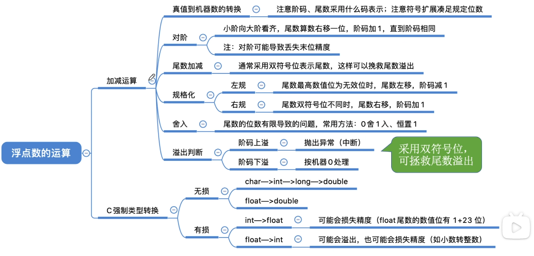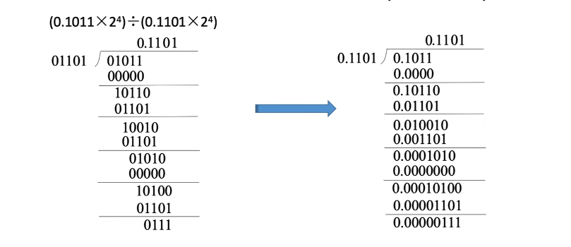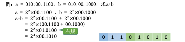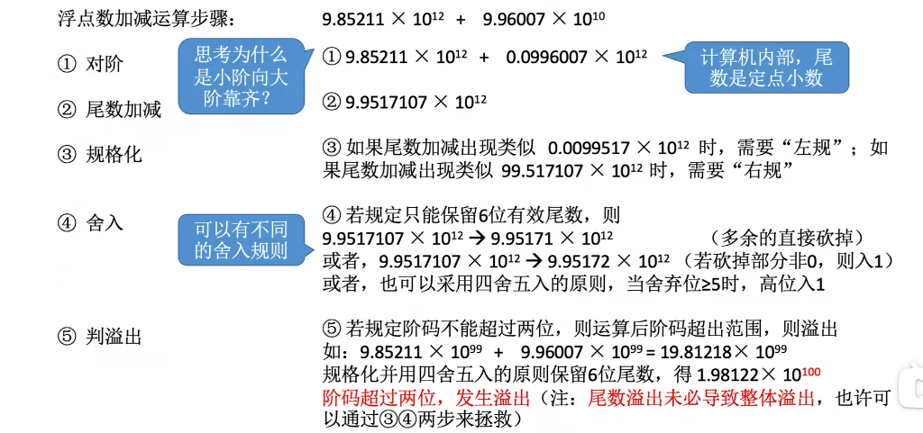 - 当浮点数运算的结果尾数出现溢出(双符号位为01或10)时,将尾数算数右移一位,阶码加1。