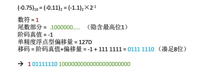 【例】将十进制数-0.75转换为IEEE 754的单精度浮点数格式表示: