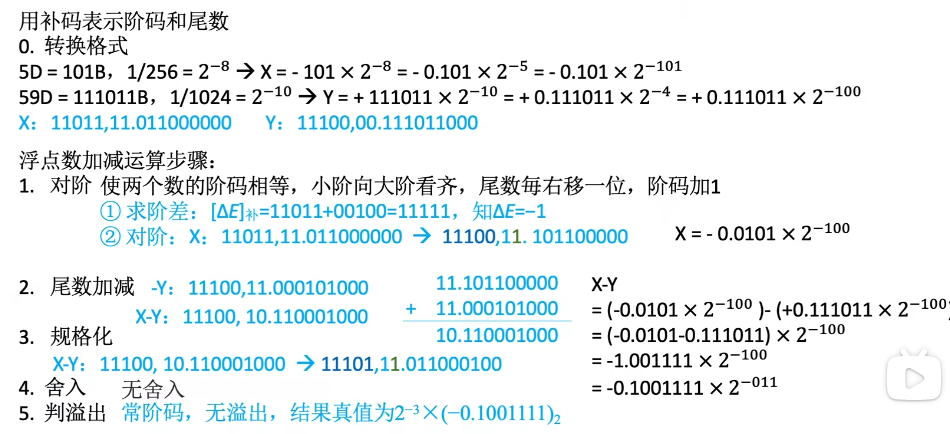 【例】已知十进制数X=-5/256、Y=+59/1024,按机器补码浮点运算规则计算X-Y,结果用二进制表示,浮点数格式如下∶阶符取2位,阶码取3位,数符取2位,尾数取9位